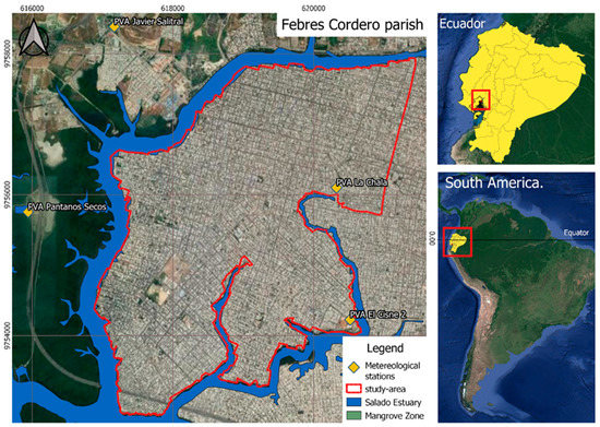 Guayaquil is the second largest city in Ecuador (354.7 km2) and the main economic driver of the country [12]. Due to its low elevation (~5 m a.s.l.) and its location in a low-lying delta surrounded by the Guayas River to the east and the Estero Salado estuary to the southwest, the city is vulnerable to urban flooding. Normally, the rainy season occurs from January to April, producing 80% of the city’s annual precipitation. In addition, events like ENSO (positive and negative phases) have strong effects on stormwater systems [13]. However, areas such as the Febres Cordero (FC) parish in Guayaquil not only receive intense rains, but the tidal influence that blocks outfalls from the stormwater system causes floods. The rapid urbanization, deficient planning, and scarcity of green areas exacerbate flooding problems [14].