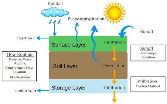 The LIDs listed in Table 3 were adopted to reflect the assessed scenarios in SWMM. The Horton method for infiltration and the dynamic wave routing for solving one-dimensional Saint Venant equations for flow routing were applied. The Manning’s equation to calculate the surface runoff and conduit flow were also followed [15]. Runoff, total inflow, and flooding were evaluated as metrics based on reduction rates of the peak flow on the whole system. The minimum reporting step time used to run the SWMM model was of 5 min (0.08 h).