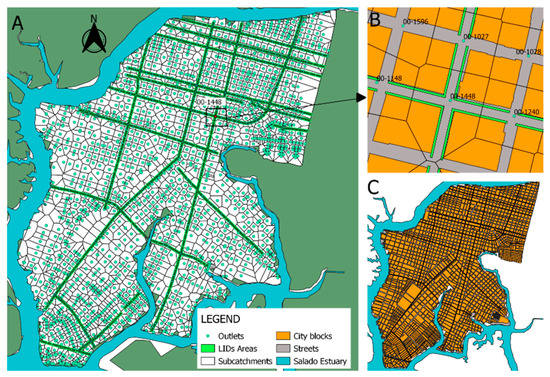 Subcatchment delineation and pipe system for the Febres Cordero parish: (A) Subcatchments based on Thiessen polygons in the study area, (B) View of a subcatchment composed of area LIDs, streets and city blocks with impervious surface, (C) Discretization of the study area to locate 1740 rain barrels of 55 gallons as LID strategy, one for each block.