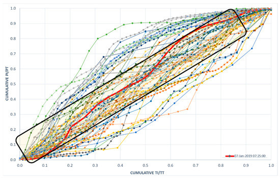 78 normalized storms plotted from March 2018 to July 2019. The typical event is the storm which occurred on January 07 of 2019 (red line) and was registered by the “Pantanos Secos station”. It started at 7:25 a.m. and finished at 10:45 a.m. Normalization processes considered accumulative rainfall (PI) and storm duration (TI) to total rainfall (PT) and total duration (TT) respectively.