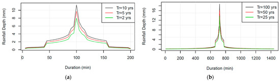 With a duration of the typical rainfall event of 200 min, the design events are as follows:, the rainfall volume is 69.69 mm for a 2-year event, 85.35 mm for a 5-year event, and 99.2 mm of rainfall for a 10-year event (Figure 5a). For extreme events, over 25-, 50-, and 100-year return periods, estimated rainfall volumes are 187.6 mm, 218.1 mm, and 253.4 mm, respectively. All of them are built with a rainfall duration of 24 h. The hyetographs in Figure 5b represent the three scenarios.