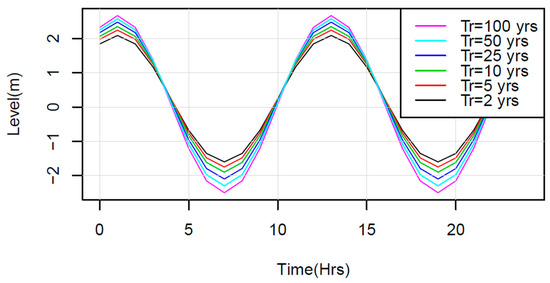 The levels for extreme tidal events are of 2, 2.1, 2.15, 2.22, 2.4, and 2.6 m for the events associated with return periods of 2, 5, 10, 25, 50, and 100 years, respectively (Figure 6).
