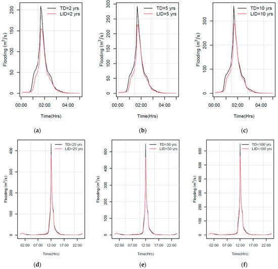 The peak runoff of the baseline scenarios (i.e., TD mode) and contrasted with the LID mode has a max ratio of reduction of 21% for the 2-year recurrence period (279 m3/s and 220.7 m3/s, respectively), 18% for the 5-year recurrence period (349.7 m3/s and 289.4 m3/s, respectively), and 17% for the 10-year recurrence period (414.3 m3/s and 345.4 m3/s, respectively). Hyetographs are shown in Appendix A and Figure A6a–c. For extreme events, a reduction of 15% for the 25-year recurrence period (527.6 m3/s and 442.1 m3/s, respectively), 14% for the 50-year recurrence period (611.85 m3/s and 523.7 m3/s, respectively), and 14% for 100-years recurrence period (722.6 m3/s and 620.6 m3/s, respectively) were observed. Hyetographs are shown in Appendix A, Figure A6d,e.