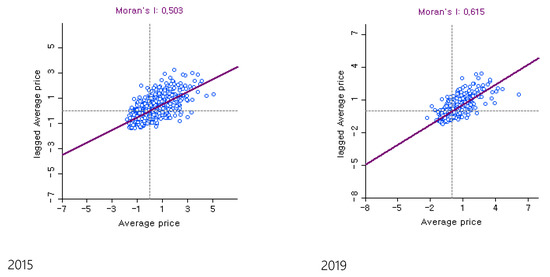 As a result, as shown in Figure 2 below, Moran’s I statistics was found to have a positive (+) spatial autocorrelation: 2015 (Moran’s I = 0.503) and 2019 (Moran’s I = 0.615). This suggests that there is a need to control the space effect by using the spatial regression model when establishing a pricing model in Figure 2.