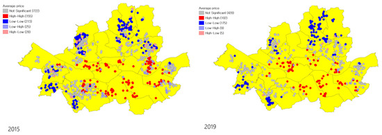 LISA distinguishes HH and LL clusterings and HL and LH areas, in the areas having statistically significant values, with local Moran’s I statistics. As a result of the analysis, it could be found that HH and LL appeared similarly in similar areas in both 2015 and 2019. In 2015, among 1143 multiplex houses, HH–155, LL–213, and LH were identified as 25 cases and HL as 28 places and in 2019, among 711 multiplex houses, HH–102, LL–175, and LH were identified as 9 cases and HL as 5 places. High-priced multiplex houses were clustered in Gwangjin-gu, Seocho-gu, and Gangnam-gu in 2015 and Gangnam-gu, Seocho-gu, and Songpa-gu in 2019. Low-priced multiplex houses were seen to be clustered in Eunpyeong-gu, Gangbuk-gu, and Dobong-gu in 2015 and Gangbuk-gu, Dobong-gu, and Geumcheon-gu in 2019.