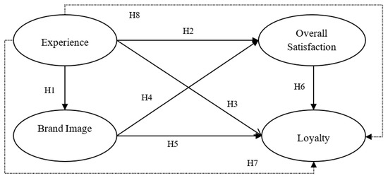 Identifying the determinants of loyalty will allow managers to concentrate on the major influential factors that lead to customers’ repeat purchases or visits. Previous studies have shown that satisfaction, quality/performance, image, emotions, and motivation are good predictors of loyalty [20,21,97], with satisfaction displaying a strong relationship to loyalty [98,99]. Satisfaction typically plays a mediating role between visitors’ experiences and loyalty. For example, Chao [100] reported that brand image and satisfaction play very important roles as mediators to establish customer loyalty. Similarly, Han, Back, and Barrett [101] found that satisfaction fully mediated the relationship between affective experiences and loyalty behaviors. However, this role is not consistent across all study results. Barnes et al. [73] found that satisfaction only partially mediated the relationship of experience and loyalty behaviors, while Prayag et al. [25] even reported a nonsignificant mediating effect of satisfaction. The same situation applies to the effect of brand image. In a study of airline customers, Brodie et al. [96] found that brand image has no direct effect on loyalty, but affects loyalty through its influence on customer value. Faullant et al. [30] further noted that the importance of image and satisfaction on predicting loyalty differs depending on visitors’ experiences, with image more influential for repeat customers. Still, in the tourism field, research investigating the mediating roles of brand image and satisfaction on the relationship between experience and loyalty is limited. It is argued that satisfaction is a necessary but insufficient condition for encouraging positive loyalty behaviors [102]. In other words, loyalty cannot be predicted by satisfaction alone and it is best explained by combining both satisfaction and other variables such as brand image and affect (experiences) [72,103,104,105]. Based on the above discussions, combined with hypothesis 1 (the influence of experience on brand image), the following hypotheses are posited: