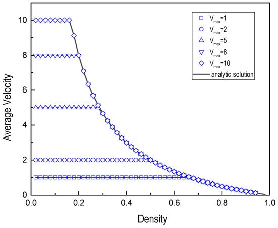 According to Equation (24), we can perform simulation experiments to obtain the fundamental diagram, which can reflect the movement of traffic flow on the road. At low density, the traffic flow is in the free-flow state of maximum velocity, while at high density, the traffic congestion is at low velocity. Based on Equation (24), we can figure out that the slope of curves from the equation of the fundamental diagram is: