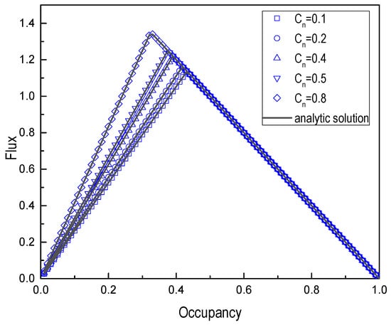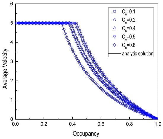 As can be seen from Figure 3 and Figure 4, the numerical simulation was consistent with the analytical solution. Traffic flow was proportional to occupancy, C, in the free flow and decreases with occupancy, C, in the congested state. Because of the rise in mixing ratio, Cn, the increase of short vehicles will lead to traffic jams easily. Moreover, when the occupancy is small, Figure 3 displays that the flow rate has different slopes due to the mixing ratio, Cn. In the case of traffic congestion, the flow rate slope was the same and had nothing to do with the mixing ratio, Cn. The curves in Figure 3 merged into a line whose slope is −2. These numerical simulations were in good agreement with Equation (25) obtained from the theoretical analysis.