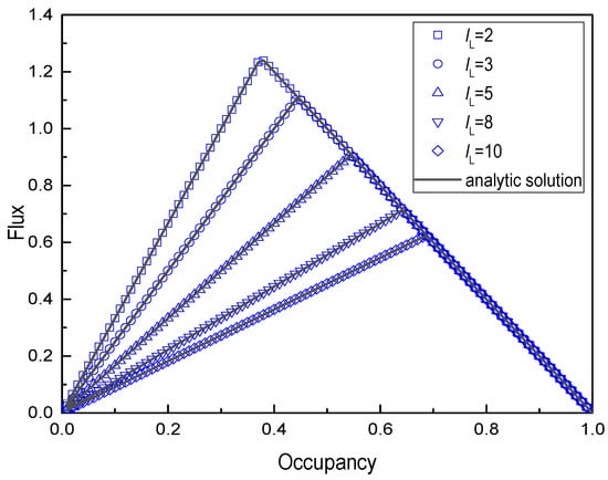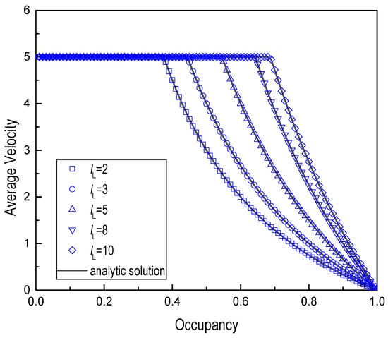 To study the effect of different lengths of vehicles on mixed traffic flow, we changed the length of the long vehicle and kept the short vehicle length constant (lS = 1). The maximum velocities of the long vehicle and short vehicle were, respectively selected as = 10 and = 5 and the mixing ratio Cn = 0.5. Figure 5 and Figure 6 show the fundamental diagrams and average velocity for long vehicle length lL = 2, 3, 5, 8, and 10 cells, respectively. All figures show that the numerical simulation was in agreement with the analytical solution.