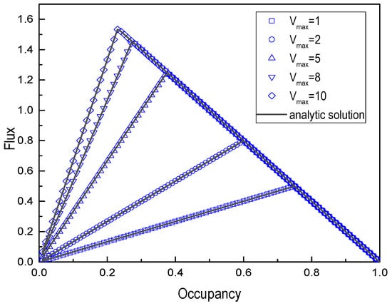 Similarly, we changed the maximum velocity of the short vehicle and fixed the maximum velocity of long vehicles to study the effect of the maximum velocity of mixed traffic flow. The length of the longest vehicle and the maximum velocity were, respectively selected as lL = 2 cells and = 10. Accordingly, the mix ratio was = 0.5. In the same way, Figure 7 and Figure 8 show the fundamental diagram and average vehicle velocity vs. occupancy for different maximum velocities of the short vehicle, = 1, 2, 5, 8, and 10.