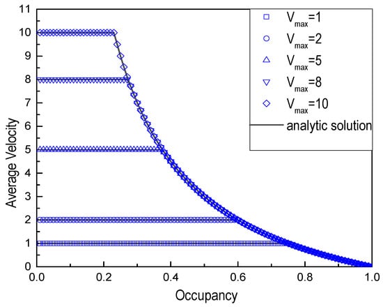 As time evolves to the steady state, vehicles can move with the maximum velocity at low occupancy. According to Equation (18), the average velocity of the free flow of the vehicle is . At high occupancy, the average velocity of the traffic flow is V rather than the maximum velocity . From Equations (6) and (17), the average velocity, , of vehicles at high density is derived. Therefore, the average velocity vs. occupancy, , is represented as the following relationship: