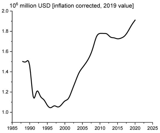 The latest events in the world (e.g., war in Ukraine) [11] and their wide-range media coverage [12] considerably increase the professional and public attention towards the environmental burden in general [13,14,15], and for the soil pollution in particular [16,17] caused by military actions. The importance of the question is increasing because—contrary to the optimistic expectations some decades ago—the military expenditures are rapidly increasing (Figure 1): Currently, their level is 26% higher than in the last years of the cold war era.