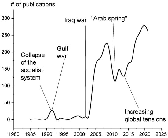 The analysis of the dynamics of the number of publications (Figure 2) shows that—even though the first publication appeared in the database as early as in 1977—one can speak of a continuous publication activity only from 1985. The interest in the topics was boosted in the first half of the nineties by two factors: The collapse of the Soviet Union and the Warsaw Treaty Organization (collective defense treaty established between the Soviet Union and its satellite states in Central and Eastern Europe). These processes caused a considerable re-location of armed forces, especially in Europe and Central Asia [16]. The abandoned training grounds, airfields, ports, etc. can be characterized by considerable environmental pollution [40]. The above-mentioned changes in the international political atmosphere created new possibilities for scientists to apply well-founded methods to determine the burden on the environment caused by military operations [41]. Obviously, neither the problem of recultivation of abandoned military bases nor the Gulf War [42] has been able to generate a continuous increase in the number of publications.
