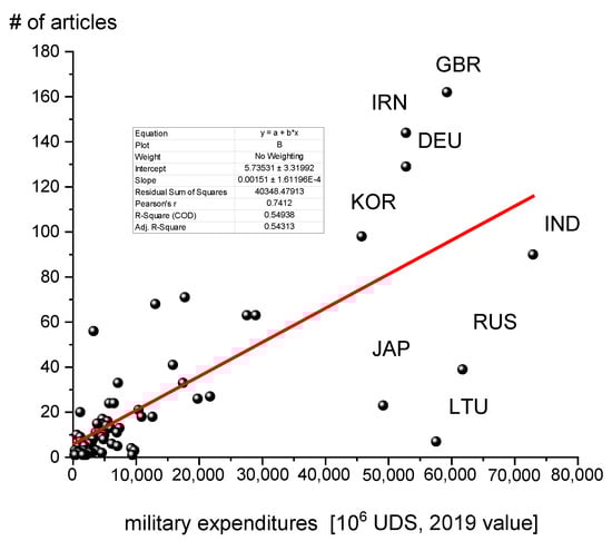 Analyzing the geographic distribution of articles on the base of the corresponding author’s nationality, it is obvious that 83% of the total number of articles is produced in twelve countries. The majority of the articles have been written in the most developed states (Table 2). This can be explained by the fact that in the conflicts of the last half century, the military of the most developed states (e.g., USA, UK, France) have taken an active part from Vietnam to Afghanistan. On the other hand, in these countries, we see an extremely strong green movement, and the sensibility of the population towards environmental pollution is very high. As a result, there is a pressure on governments in general and military in particular to pay considerable attention to environmental problems and to the adverse consequences of military activity. In the case of some countries (e.g., China), the analysis of soil offers a favorable possibility to prepare a preventive (pro-active) environmental policy. Last but not least, for some countries (e.g., Italy, Germany, South Korea, France), the environmental consequences of military activities in the first and second world wars remain only partially known. If we calculate a regression between the number of articles written on this problem and the military expenditures, determined on the basis of the internationally recognized Stockholm International Peace Research Institute, converted to US dollar, it is obvious that there is only a relatively low level of correlation between military spending and the articles on the ‘military activity’—‘soil pollution’ (Figure 3). This fact highlights that this question is in focus only in a few relatively developed countries. Numerous heavy spending countries have paid little attention to the systematic review of this problem.