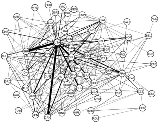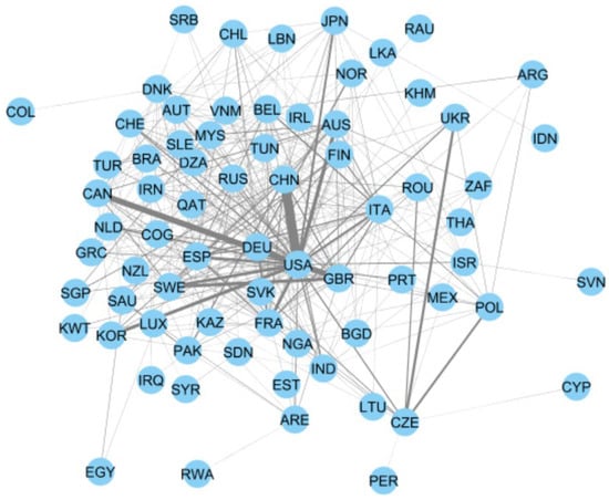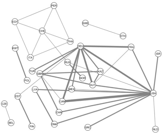 International cooperation between different countries measured on the basis of co-authorship between 2016 and 2022. The thickness of edge lines is approximately proportional to the number of co-authored publications. The countries are indicated by their three-digit ISO code.