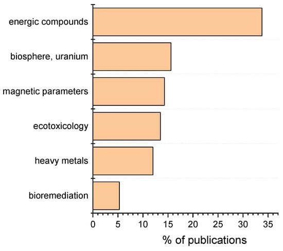 The largest group of publications analyses the effect of organic energetic compounds on the environment. The second cluster consists of papers focusing on heavy metal and trace element pollution of the fields. The third group of publications is devoted to the study of the relationship between magnetic parameters and soil contamination. The fourth cluster applies a more holistic approach, analyzing the impact of military operations on the biosphere. In this cluster, the investigation of depleted uranium has relatively high importance. This problem is analyzed on the basis of experiences of the Gulf war and armed conflicts in former Yugoslavia. Cluster No. 5 deals with the military-caused problems from the point of view of ecotoxicology, mainly on the base of analysis of collembola and fungi. A small group of publications focuses on the possibilities of soil bio- and phytoremediation. Another group of papers deals with a rather specific aspect: the application of miscanthus × giganteus in phytoremediation procedure. The last group of publications analyses some microbiological aspects found on military training sites, but these are not directly associated with the problems of soil pollution.