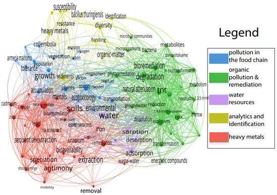 The largest group of publications analyzes the effect of organic energetic compounds on the environment (depicted in green color). Interestingly, here, in this cluster, the possibilities of bioremediation and phytoremediation are indicated. The application of biological materials for decreasing soil contamination has received a considerable level of interest since the nineties of the last century. This can be explained by the fact that this potential method of improvement of soil condition needs intensive research because (1) a considerable number of pollutants cannot be cleaned up with the use of bioremediation [46], (2) in some cases, the biological pathways of decontamination can lead to even more dangerous products [47], (3) the most straightforward way of development is the application of genetically modified microbes or plants, but the current regulatory system in numerous countries goes against this development [48].