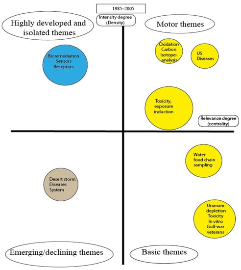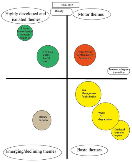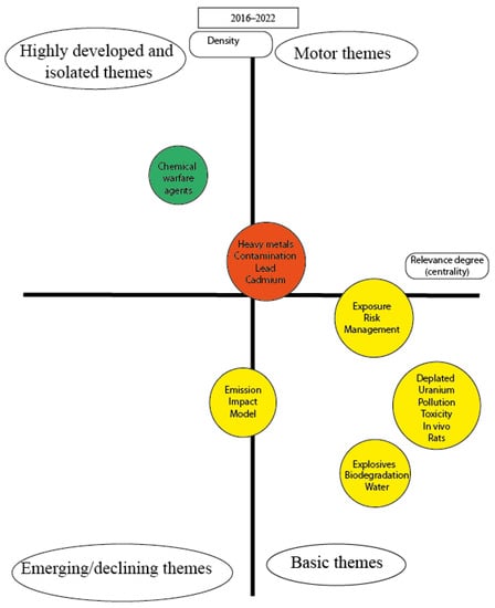 As we have seen, the rigorous research on the consequences of military activities on soil pollution is a relatively young, evolving field of science. That is why the understanding of the direction of development can be important to get a more complex picture regarding the ways of future research activities. Cobo et al. have developed a method based on the clustering of articles to determine the position of different research topics in the intellectual space [49]. Their method consisted of two steps: The determination of the clusters of the topics on the base of co-occurrence of relevant words and on the base of citation analysis to determine the characteristic features of intellectual dialogues within and between these clusters. According to their theory, the position of various topics can be depicted in a two-dimensional space determined by the intensity of dialogues (expressed by the number of citations) between the clusters and the intensity of citations within the clusters. The former indicator is called centrality, the latter is density. According to their theory, if a topic is “hot” then there is an intense dialogue within the cluster, containing this topic and between the different clusters. These topics are called motor themes by the authors. Some other themes are intensively cited, but there is a relatively low intensity dialogue within these clusters. These are highly developed and relatively isolated issues. The emerging and developing/or declining topics can be characterized by a low level of density and centrality because the academic community has not yet been organized around these topics. A further group of topics can be characterized by a high level of interest in the topics, but the intensity of communication within this cluster is relatively low. These are the basic topics which are considered a cornerstone of further development.