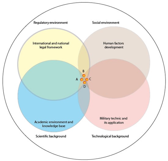 Obviously, the regulatory framework development is essential if we would like to achieve an optimal synergy between different factors depicted in Figure 12 by A–B–C–D polygon. This is true for the allocation of monetary resources for environmental research and the more flexible regulation of new technologies, e.g., molecular genetics. Currently, the rigid regulation of genetically engineered organisms in the EU is an efficient barrier to the further development of phytoremediation projects [54]. The academic knowledge base is increasing rather rapidly, but—as we have seen on the base of analysis of dynamics of publications—the different projects depend on financial resources. It is clear that the best results can be achieved on the base of long-range research efforts, which demand well predictable material resources. The technological background development involves a continuous modernization of military technology. In this case, the decision-makers need to strike a balance between military performance, cost efficiency, and environmental aspects. Last but not least, the human factor development is central from two interrelating aspects: The better trained, more environmentally conscious soldier pays more attention to the environmental consequences of his/her decisions (e.g., the organization of cleaning of the military technics). Therefore, the efforts for environmental education of military personnel must be considered a long-range investment because these educational efforts will contribute to the general upgrading of the knowledge level of the society on technology-environment interrelationships. Conscripted or professional soldiers, after leaving the army, can be important advocates of the application of environment-friendly methods in all fields of life.