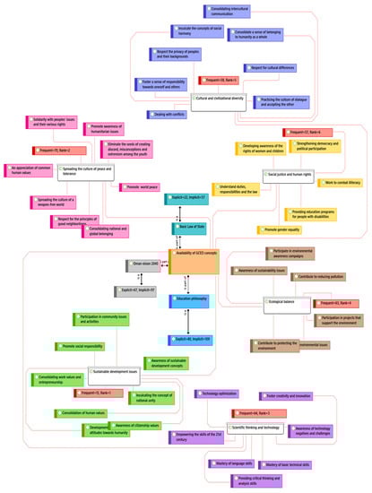 Thematic data analysis has been applied in QDA using Atlas.ti9 software. Six main themes have been identified for analyzing the inclusion of global citizenship concepts in national policies: (1) Social justice and human rights; (2) Spreading the culture of peace and tolerance; (3) Sustainable development issues; (4) Cultural and civilizational diversity; (5) Ecological balance; (6) Scientific thinking and technology. Under each theme, 8–7 sub-themes have emerged. Frequencies have been calculated for each theme and sub-theme to reflect their importance in the three national policy documents.