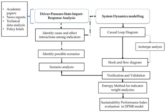 One of the main advantages of the framework is providing a theoretical explanation of how the problem emerged in the first place using the driving force element of the DPSIR framework. These driving forces can be entirely different for projects based on how the modeller defines the problem and boundaries set in the model variable selection process [25]. A further advantage of the methodology in Figure 1 is the utilising of ‘archetypes’ to describe dynamic phenomena and ‘common stories’ of CLDs that repeatedly occur in the system’s diverse sets of behaviour and contexts [25,26].
