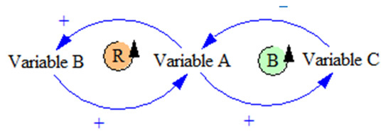 A qualitative analysis is performed based on existing studies, varying goals and scopes, system boundaries and functional units of selected indicators and factors. For example, in Figure 4 the ‘+’ signs at the arrowheads signify that the effect is positively related to the cause (an increase/decrease in variable ‘A’ leads to an increase/decrease in variable ‘B’), while ‘−’ signs signify the opposite [42]; ‘R’ indicates a reinforcing loop, ‘B’ indicates a balancing loop, and B1 stand for the loop number. It should be noted that there can be multiple reinforcing and balancing loops in a model, but the system boundary is based on the identified problem and the scope of the project.