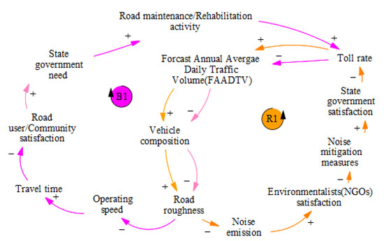 Loop R1 begins with the improved road roughness (pavement condition) from loop B1, which causes reduced noise emission per vehicle [49]. Eventually, this improves/satisfies environmentalists’ requirements and strategies to undertake the noise mitigation measures. In general, road infrastructure costs may be divided into capital costs (typically up-front) and recurrent costs (maintenance and operating) [39]. Therefore, initiatives such as noise mitigation measures can affect maintenance costs (neutral, increase or decrease) depending on the initiative [49]. Thus, the Government tends to be neutral on toll charges as there is no additional need to undertake noise mitigation measures. However, according to the Senate Economic Reference Committee Report, a criticism is that tolls cause people to travel on alternative routes [47]. Thus, the traffic volume in the current situation may tend to increase in the long term, causing noticeable road surface deterioration.