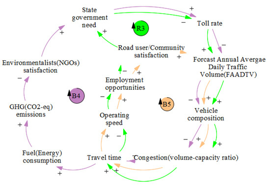 The operating speed is ‘the highest overall speed at which a driver can travel on a given highway under favourable weather conditions and prevailing traffic conditions’ [60]. Thus, an increase in travel time from loop B5 indicates a decreased operating speed on the route. Further decreased feasible commute affects employment opportunities as road users with a low value of time switch to a less convenient mode or pay a charge that exceeds the value of their time savings. Thus, the tyranny of distance comes into play, implying that people must travel further and pay more operational costs to access employment and essential services [58]. Moreover, road users should only pay tolls when they cause congestion inside the toll ring. Therefore, toll discounting by the Government could increase the level of attraction of traffic volume towards the network, leading to an increased private vehicle proportion on a long-term basis. This induces congestion and increased travel time over the operational road phase, making R2 a reinforcing loop.