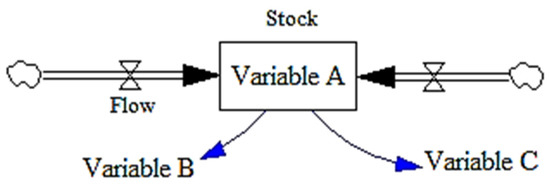 Once a good understanding of the problem situation is gained from the archetypes, model articulation begins by transforming the conceptual model to a quantitative representation to simulate the model. Consequently, formal modelling requires more precision than purely conceptual modelling. Formal modelling involves the identification of the stocks and flows [61]. It involves the specification of the functional forms representing the relationships between variables covering the same set of relationships. A stock collects all inflows and serves as the reservoir and source from which outflows emerge. A flow serves as a mode to deliver or drain resources from the stock. The value of a flow can be positive or negative. A positive flow is an inflow that fills the stock, and a negative flow is an outflow draining the stock. In Figure 8, the stock volume will change at different time points as both inflows and outflows are generated as time goes on.