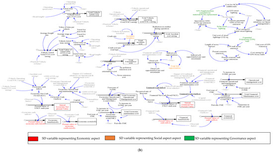 (a) Stock and flow model of the road infrastructure system depicting environmental and social aspects; (b) Stock and flow model of the road infrastructure system depicting economic, governance and social aspects.