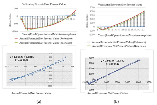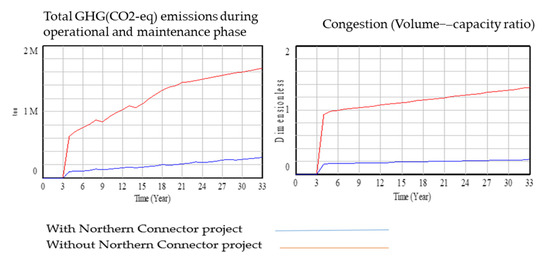 The present study made efforts to evaluate the proposed sustainability indicator’s performance over the 30-year operational phase. The base case was constructed to consider two options for the project case implementation: a freeway and a toll road.