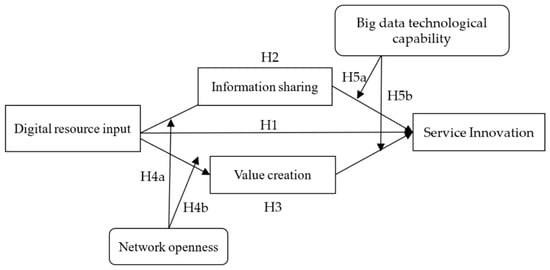 An enterprise’s developing digitalization strategy is bound to the innovation of the products and services through the digital resources layout; scholars have researched that digital resources, information sharing, the relationship between digital resources and information sharing is positive, and have put forward the theoretical construction of value-added information. It is believed that enterprises can increase their digital construction process and digital platform through a large number of digital resources, such as talents, finance, hardware and software, and on this basis, increase the scope and degree of information sharing. Through investigation and analysis of a large quantity of enterprise data, it has been shown that information sharing can improve the degree of enterprise information exchange, which can be achieved through relevant R&D investment in information technology, verifying this statement with data. Therefore, enterprises can improve the degree of information sharing based on digitization by investing in digital resources. Bharadwaj [39] and Mithas et al. [40] found that enterprises can reduce resource loss and costs in the process of information transmission through a higher level of digital investment, and by increasing the efficiency of information sharing and transmission while reducing costs. The enterprise’s digital information technology is rapidly transferred in the internal process and platform of the enterprise. Thu, the process of digital resources of the enterprise effectively improve the enterprise’s use of digital platforms for the construction of investment and technology to improve the degree of customer and market information exchange and sharing. If enterprises of information technology or digital building networks have a certain degree of opening to the outside world, they can promote more digital resources to enhance the degree of information sharing. Network openness was first proposed by Rusanen et al. [41] to illustrate the degree of external cooperation and communication of enterprises, and it also plays an important role in the concept of open innovation. In this process, it is very important that the data and network platform of digital investment has a certain openness, which will effectively improve the information-sharing ability of digital investment. Openness is the main characteristic of the open network platform or the acquisition of external resources to strengthen information collection ability, so that they can through open characteristics for enterprise strategy execution of the complementary strategic resources, network openness can reflect the enterprise internal information network degree of openness and innovation; therefore, it also plays a certain role in promoting information sharing and service innovation. Based on the above analysis, hypothesis 4a is proposed.