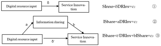To test Hypothesis 2 and Hypothesis 3—whether information sharing and value creation play a mediating role in the impact of digital resource input on service innovation—this paper establishes a model based on the mediating effect test method. Firstly, models ①–③ is established to judge the mediating effects of information sharing (represented by IShare) and value creation (represented by VCrea) of the explanatory variable digital resource input (represented by DRInv) on the explained variable service innovation (represented by SInno). If DRInv is able to influence SInno by influencing IShare (or VCrea), then IShare (or VCrea) is called a mediator variable (Figure 2 is the corresponding path diagram). δ represents the total effect of DRInv on SInno, ab represents the mediating effect of DRInv through IShare, and δ ‘represents the direct effect of DRInv on SInno. If δ is significant and the coefficients a and b are significant, the mediating effect is significant [82,83,84,85]. If the coefficients δ, a and b are significant and the coefficients δ ‘is not significant, IShare has a complete mediating effect on SInno during DRInv’s influence. Similarly, the mediating effect model of value creation (VCrea) is similar.