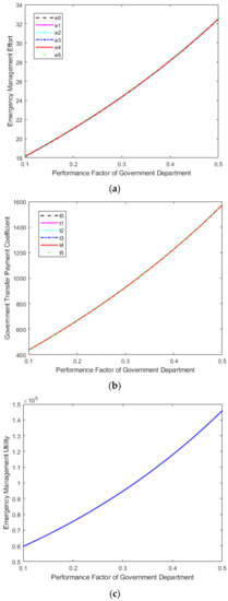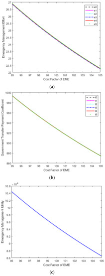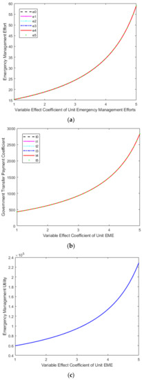 - the sensitivity analysis results of variable effect coefficient of unit EME () are shown in Figure 3. As the variable effect coefficient of unit emergency management increased, the equilibrium EMEs of all medical institutions increased, the equilibrium transfer payment coefficients of the government department for medical institutions increased, and the equilibrium utility of PES increased.