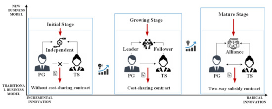 42]. Considering the three evolutionary stages of the ecosystem, this study adopts three contracts (without cost-sharing, cost-sharing, and two-way subsidy) to establish three differential models for investigating the interaction mechanism between the PG and the TS. Our results indicate that the positive interaction between supply chain enterprises can effectively promote the maximization of each enterprise as well as overall supply chain profits.