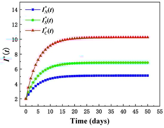 According to Equations (7), (8), (16), (16), (24) and (25), it can be concluded that under the three contract models, the comparison of the balanced technological innovation investment level of TS is: iTSN < iTSS < iTSC; the balance of technological innovation investment of PG is as follows: iPGN = iPGS < iPGC. Combining Equations (12), (21) and (27), it is easy to get IN*(t) ≤ IS*(t) ≤ IC*(t). Therefore, Corollary 3 can be drawn.