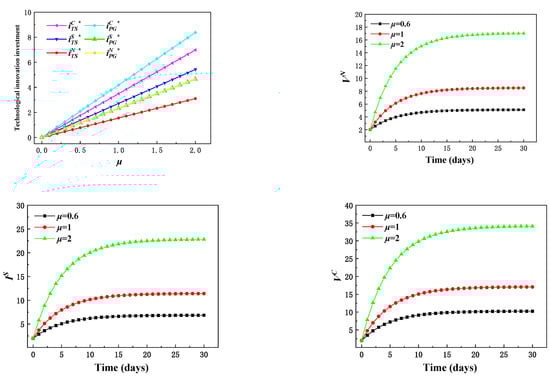 Corollary 2. Under the cost-sharing model, the optimal technology innovation investment of TS and PG are positively affected by their marginal profit πPG, πTS, and their respective technological advancement coefficients β1, β2, and demand influence coefficient μ. The discount factor ρ, technology decline rate δ, and its innovation cost coefficients f1, f2 are negatively affected. The difference is that the optimal technological innovation level of the TS is not only related to its marginal profit but also depends on the marginal profit of the PG. The reason is that the PG, as the leader of supply chain decision-making, can adjust the proportion of cost according to the marginal profit of the TS to maximize its own profit.