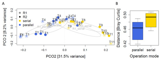 The ordination based on Principal Coordinates extracted from Bray-Curtis distances among the microbial communities suggested an influence of all experimental factors time, operation mode and reactor (Figure 3A). The microbial communities of the reactors clearly followed a time trajectory. There was also a separation of parallel and serial operation in the first dimension (31.5% variance), whereas the second dimension (8.2% variance) tended to separate the two reactors during serial, but not during parallel operation. In parallel operation, the communities within the two reactors were comparable and followed the same time trajectory. A dynamic change over time in both reactors had been expected due to the influence of the heterogeneous input material over time. The variation between reactors in parallel operation is potentially a result of being fed every other day: At the same sampling point for both reactors, one reactor is more advanced in fermenting the substrate compared to the freshly fed one. Adonis analysis supported this picture and indicated differences in community structure between parallel and serial mode (p = 0.002) and between reactors (p = 0.05). However, the variance explained by these factors was low (7% and 5%, respectively). A high portion of variance remained unexplained, from which the majority is likely due to differences over time (Figure 3A). Also, the changes in substrate composition are likely to have introduced variance and affect the microbiota. There were no significant differences in within group homogeneity as indicated by betadiver analysis (p = 0.37), which can be interpreted as homogeneity of variances. After the switch to serial operation, the communities of R1 and R2 became more dissimilar in comparison to those communities present in parallel operation (Figure 3B) (p < 0.001).
