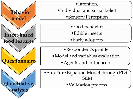 Once the articles were reviewed, most of the works developed a quantitative study to understand the behavior. The aim of the authors was to increase acceptance, and their main contributions are related to transforming insects into ingredients for food and communicating the benefits. However, social, and personal factors were considered to overcome the barriers. Nevertheless, the perceived lower environmental impact was considered to be an appreciated characteristic [,].