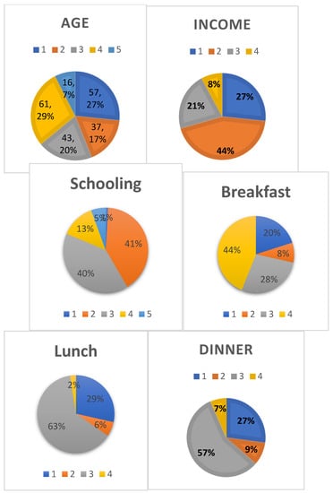 This research highlights three main variables: intention, attitude (individual beliefs), and social norms (social beliefs), as well as the influence of sensory perception on trying new foods []. Thus, this research developed and applied a questionnaire to identify socio-demographic aspects of the respondents, as well as their beliefs and perceptions. Among the most crucial demographic data, it can be highlighted that:
