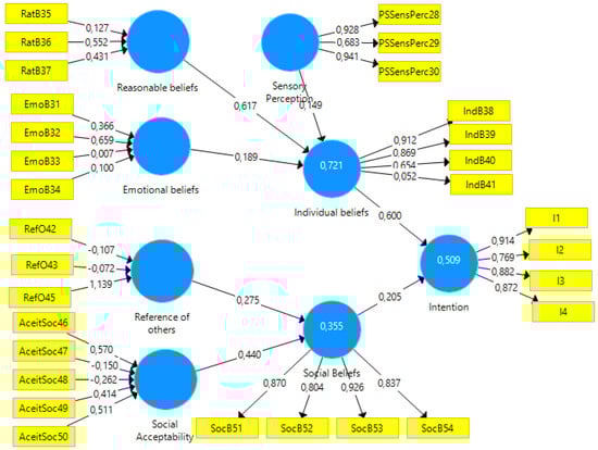 - Four reflective variables: sensory perception (with three subfactors: PSSensPerc28, PSSensPerc29, and PSSensPerc30), individual belief (with four subfactors: IndB38, IndB39, IndB40, and IndB41), social belief (with four subfactors: SocB51, SocB52, SocB53, and SocB54) and intention (with four subfactors: I1 to I4).