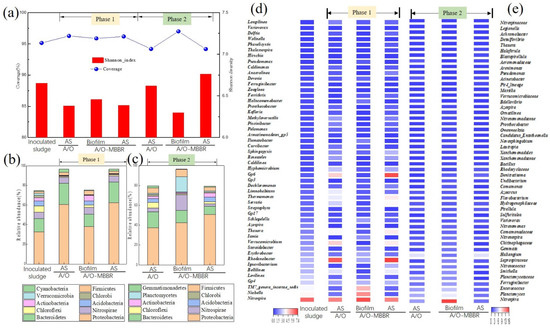 Changes in the biofilm and activated sludge (AS) diversity and community structure of IFAS and A/O systems during phases 1 and 2. (a) reveal the observed coverage and Shannon diversity index of biofilm and AS in IFAS and A/O systems (b,c) show the microbial community composition of bacterial phyla in the biofilm and AS samples of IFAS and A/O systems at phases 1 and 2 (>0.1%), and (d,e) show the microbial community composition of bacterial genera in the biofilm and AS samples of IFAS and A/O systems at phase 1 and 2 (top 50).