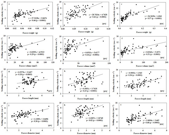 Physical characteristics of faecal pellets from bighead carp (Aristichthys nobilis) plotted against settling velocity (cm s−1) at water temperature of 10 (a,d,g,j), 20 (b,e,h,k) and 30 °C (c,f,i,l).