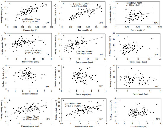Different regression analysis results were observed in bighead carp. The settling velocity of faecal pellets from bighead carp was correlated with faecal weight (p < 0.01 at 10 and 20 °C, p = 0.03 at 30 °C) (Figure 3). Similarly, the settling velocity was also positively, but weakly correlated with faecal volume and diameter both at 10 and 20 °C. However, neither volume nor diameter of faeces was correlated with settling velocity (p > 0.05) when temperature increased to 30 °C. Furthermore, no significant linear relationship was found between settling velocity and faecal length at three experimental temperatures (p > 0.05).
