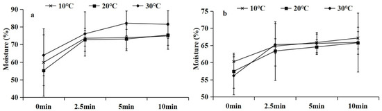 Moisture content of faecal pellets from channel catfish (Ictalurus punctatus) (a) and bighead carp (Aristichthys nobilis) (b) after immersion at different temperatures (10, 20 and 30 °C).