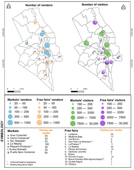 With the aim of addressing the second research objective and for complementing the spatial information obtained during visits to markets and free fairs, an interview guide was designed and applied to three municipal officials representing the following institutional departments: Popular Promotion, Economic and Social Inclusion, and Markets. These provided data on the origin of fresh food commercialised in both markets and free fairs, as well as on the number of vendors in each of these places and management difficulties. Likewise, through a reference sampling and based on the saturation principle suggested by Creswell [36], 45 vendors from the thirteen free fairs and 30 vendors from the seven markets were interviewed. A total of 75 people were interviewed during the first time period. Similar questions to those used with municipal officials were used, with some additional queries about the nature of their commercial activity—producers or intermediaries—the level of satisfaction with the municipal administration, and support received by officials. During the second time period, four vendors from a municipal market were added in 2020, and they were interviewed with the same question guide used in the previous year. During the third time period, one municipal officer was interviewed for updates on the number of trade fairs and markets, as well as the difficulties during the pandemic lockdown and after that.