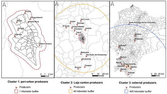 Likewise, drawing on municipal officials and vendors’ testimonies, three geographical clusters were identified to represent the origin of fresh food sold in markets and free fairs (Figure 3). The first cluster brings together food from other cities and cantons of the province of Loja, the second cluster agglomerates food from rural parishes from the canton Loja, and the third cluster brings together food from peri-urban areas.