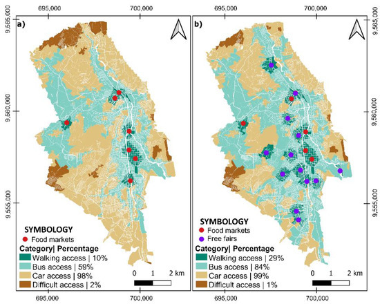 Accessibility map (10 min or less) on foot, by bus, or by private vehicle, for both markets (a) and markets and free fairs (b).