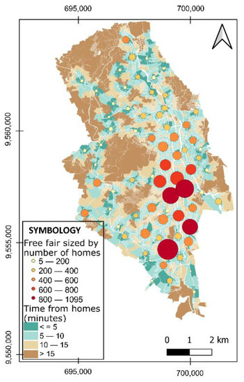 Potential location of free fairs based on existing markets. The map shows the location points of free fairs sized by the number of existing households at an access time of 10 min or less. In addition, the background shows the classification of dwellings according to the access time to markets or potential free fairs.