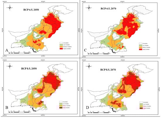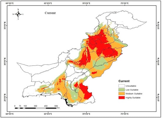 Chicago/Turabian StyleArshad, Fahim, Muhammad Waheed, Kaneez Fatima, Nidaa Harun, Muhammad Iqbal, Kaniz Fatima, and Shaheena Umbreen. 2022. "Predicting the Suitable Current and Future Potential Distribution of the Native Endangered Tree Tecomella undulata (Sm.) Seem. in Pakistan" Sustainability 14, no. 12: 7215. https://doi.org/10.3390/su14127215